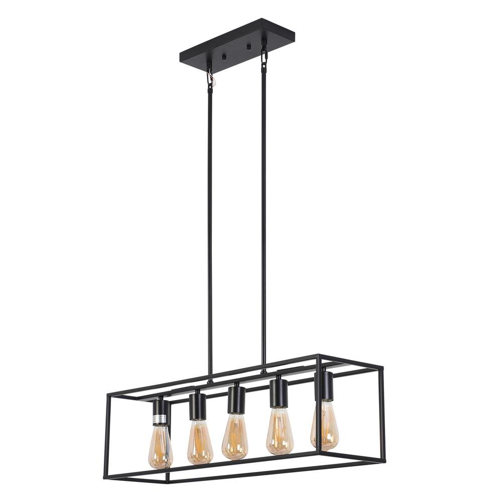 Ironclad is a sleek rectangle design 5 light, industrial-style island pendant that would be a perfect fit over a bar area and over a dining table! The metal frame is in a matt black finish. The fixture takes five 60W E26 bulbs and is compatible with incandescent, flourescent, and LED bulbs. This fixture is dry listed and UL listed, and not recommended for damp/wet locations. Recommended for residential and commercial use.